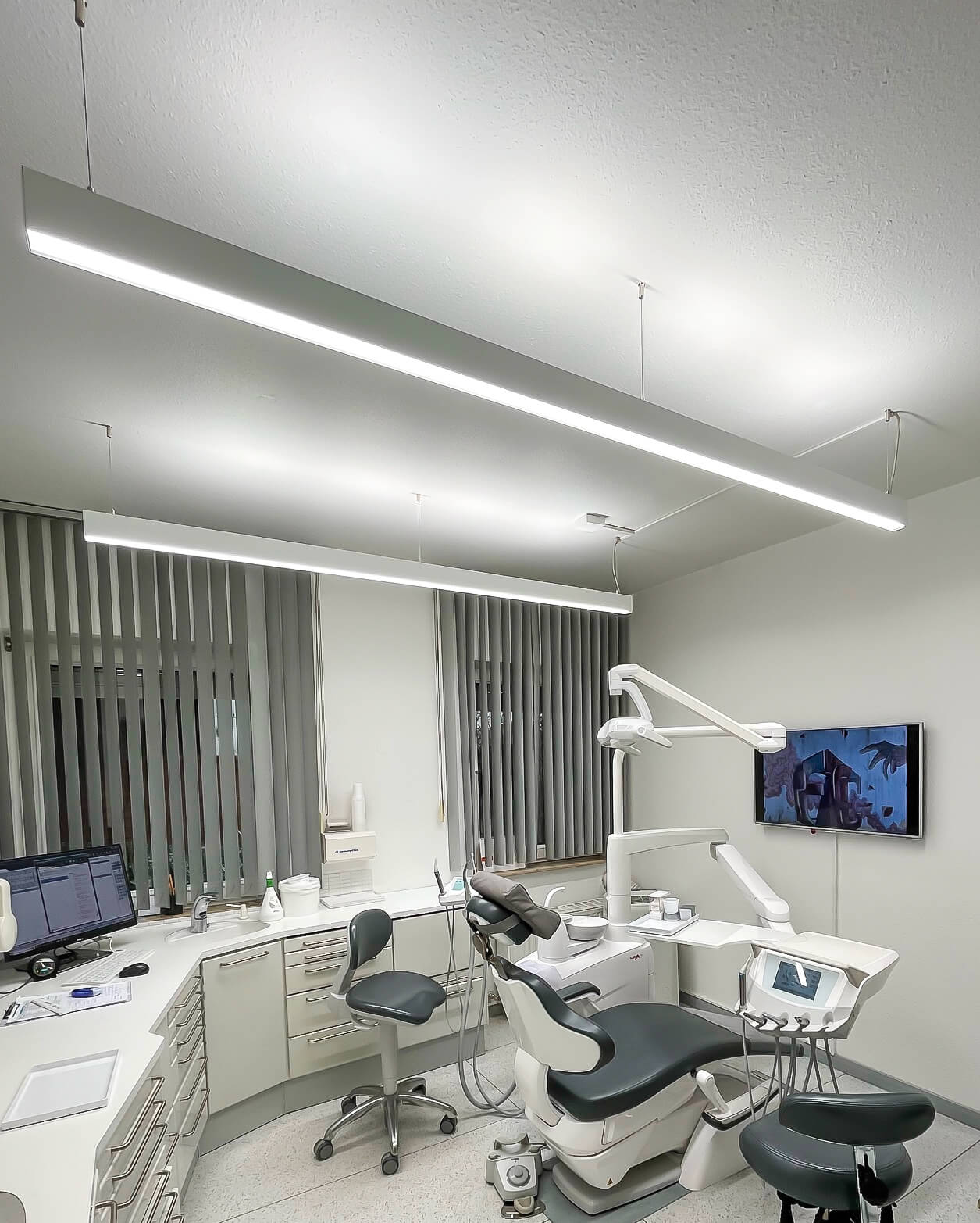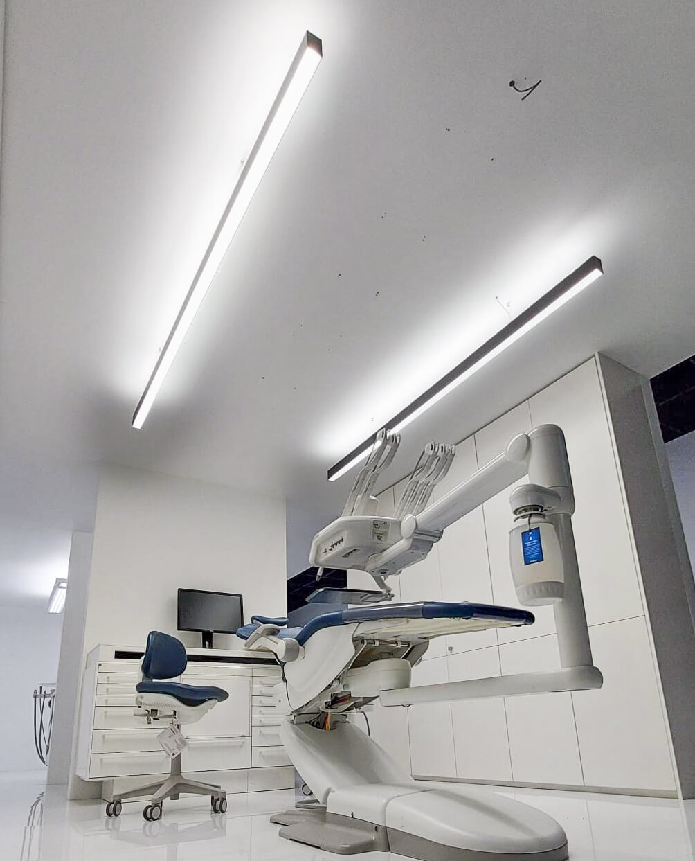 Les luminaires LED Dentled PHL22 lumière du jour à spectre complet sont conçus pour répondre aux exigences spécifiques des dentistes en matière d’éclairage du lieu de travail pour les salles de traitement, pour les lieux de circulation et la salle de stérilisation. Les drivers sans scintillement sont incorporés dans les profils en aluminium et répondent au minimum spécifié de 2000 lux d’éclairement sur votre espace de travail (appui-tête du fauteuil de traitement en position de traitement). Une solution d’éclairage LED bien pensée pour les soins dentaires, avec un design élégant, fait pour les cliniques dentaires. Disponible en blanc Ral 9003 et autres couleurs sur demande.